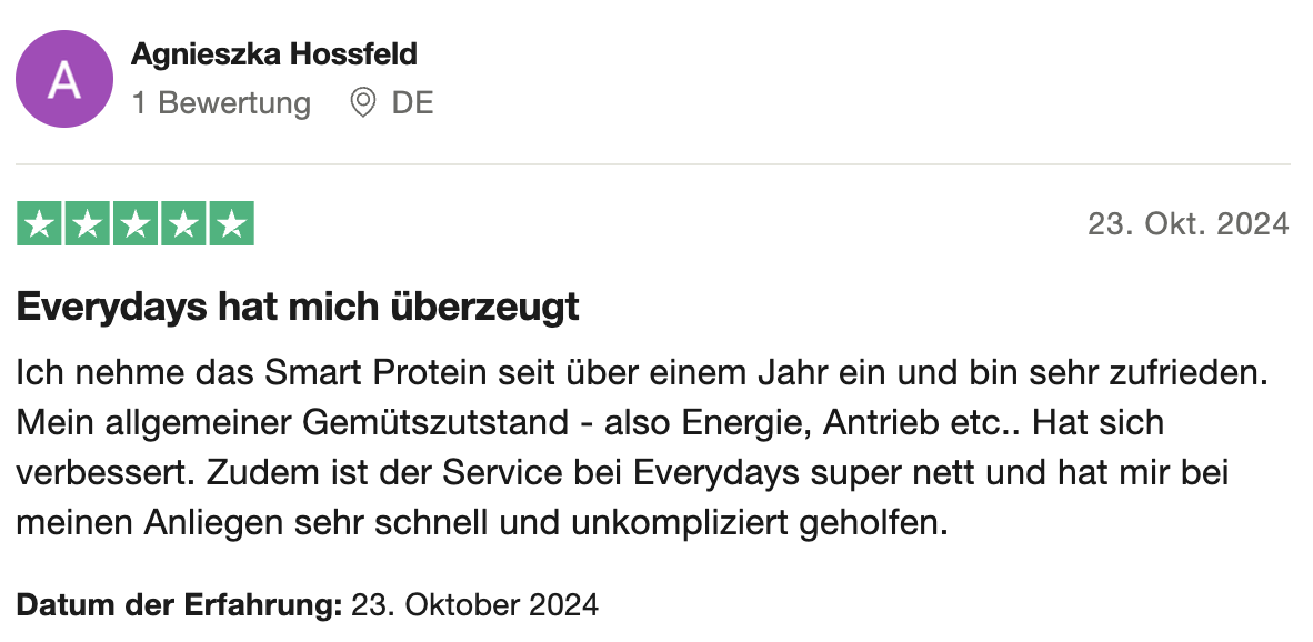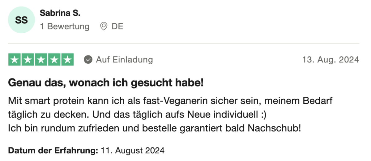 Im Rahmen unseres Kaufratgebers haben wir das Premium-Aminosäuren-Präparat über einen Zeitraum von 12 Wochen intensiv getestet und parallel über 40.000 verifizierte Kundenbewertungen auf der unabhängigen Plattform Trustpilot analysiert. Beeindruckende 97% der Anwender bewerten Smart Protein mit 4 oder 5 Sternen. Folgende Kundenrezensionen spiegeln die typischen Erfahrungen wider: