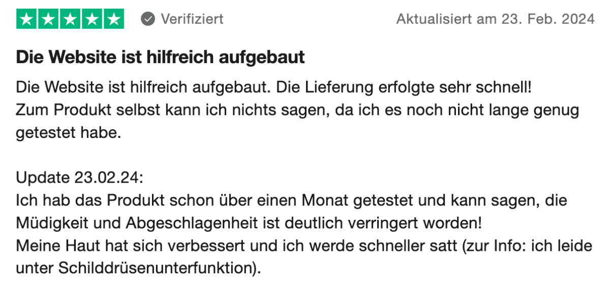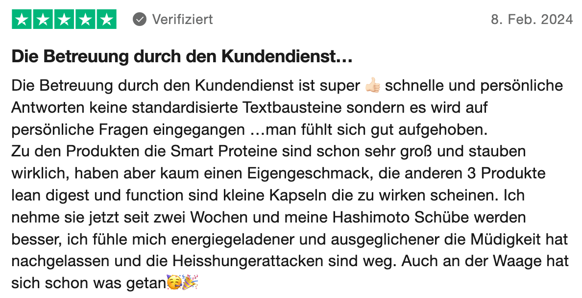 Der Test hat sich gelohnt. Ich fühle mich endlich verstanden und von Produkten unterstützt, die sichtbar auf die Bedürfnisse von uns Hashimoto-Betroffenen zugeschnitten sind.